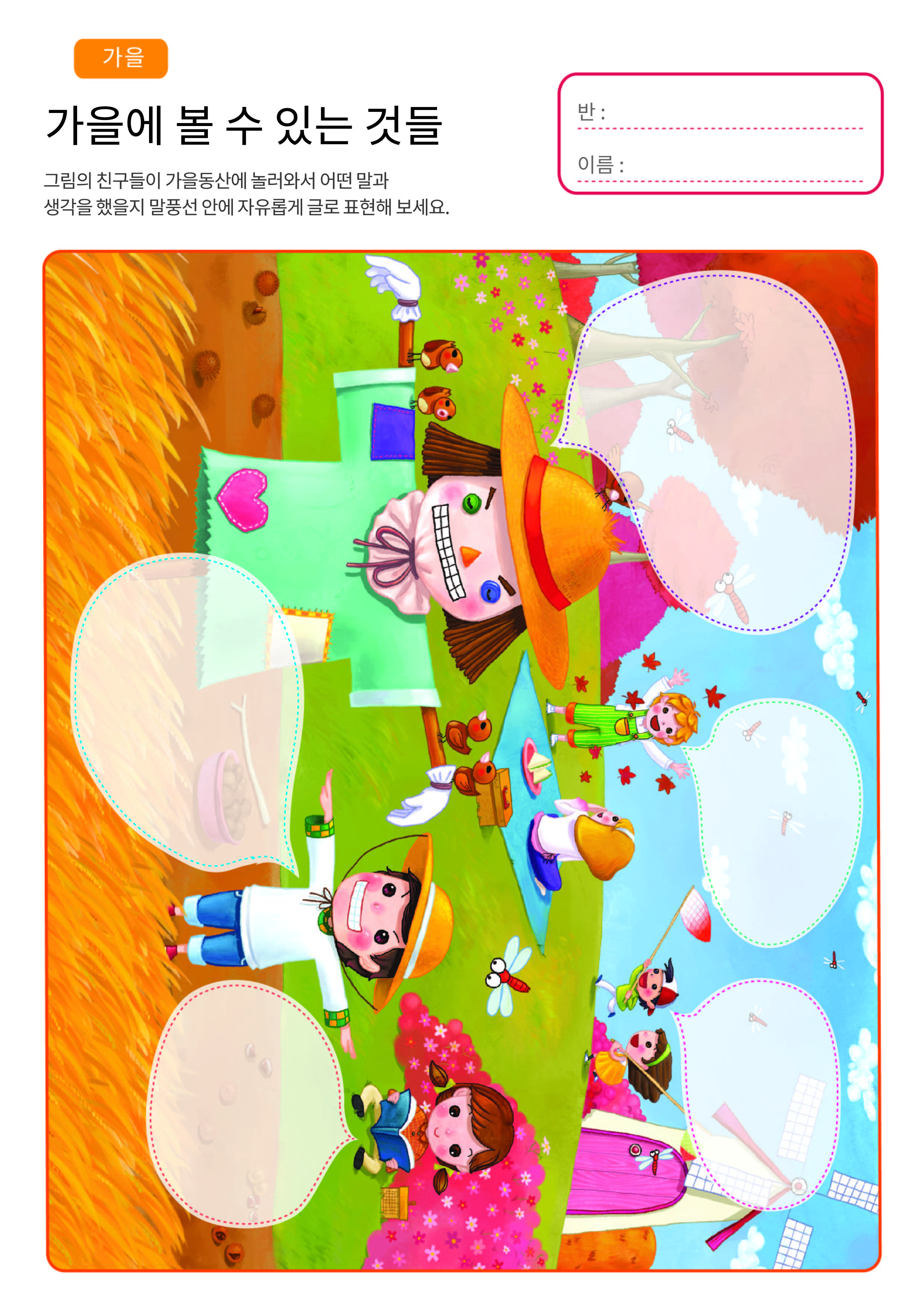 그림의 친구들이 가을동산에 놀러와서 어떤 말과 생각을 했을지말풍선 안에 자유롭게 글로 표현해 보세요.