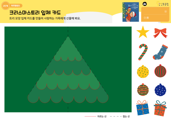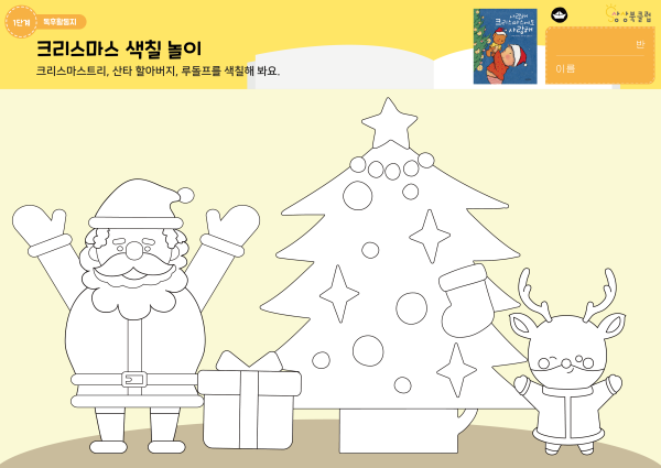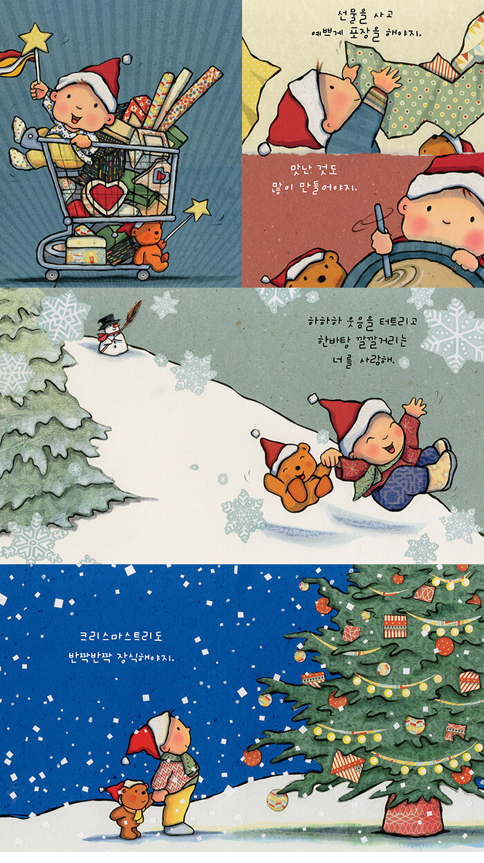 | 줄거리 | 크리스마스 휴일 동안 아이는 쇼핑을 하고, 맛난 음식을 만들어 먹고, 크리스마스 트리와 장식을 만들고, 눈밭에서 신나게 미끄럼을 타며 한껏 즐거운 활동을 한다. 엄마 아빠의 모습은 화면 어디에도 보이지 않는다. 아이의 아기인 셈인 ‘곰돌이 인형’만이 함께 그 모든 즐거움을 누릴 뿐이다. 물론 현실에서야 늘 부모가 함께할 것이 분명하다. 다만 아이 스스로 크리스마스의 기쁨과 즐거움을 온전히 누릴 수 있기를 바라는 마음이 글에 담겨, 엄마 아빠의 목소리로 다정하게 전달되는 것이다. |