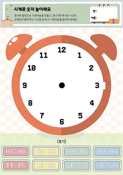 [시계로 숫자놀이해요]종이와 할핀으로 시곗바늘을 만들고시곗바늘을 움직여 보세요.
