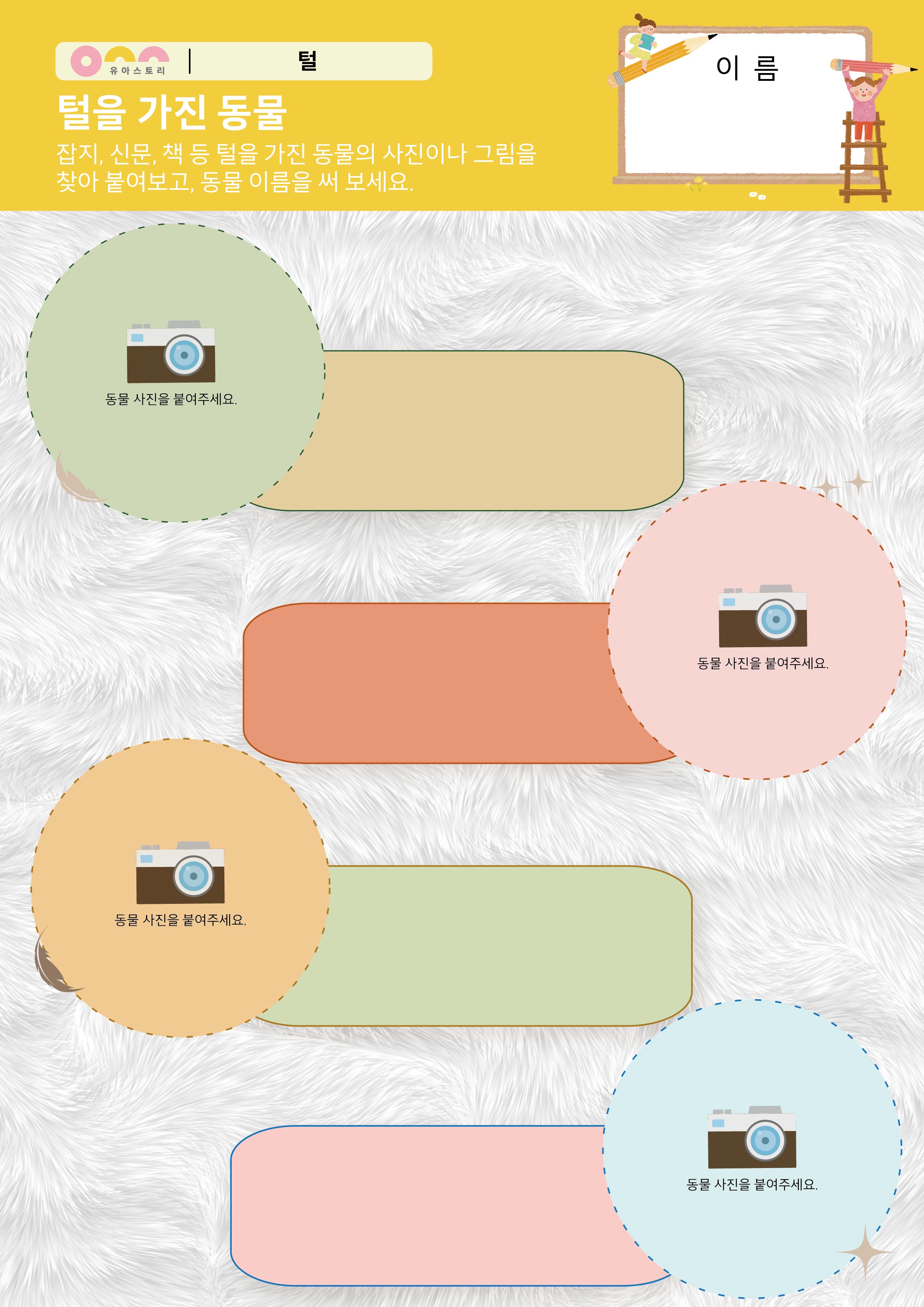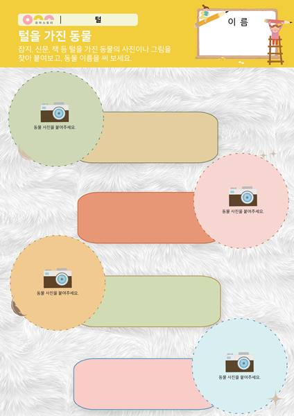 [털을 가진 동물]잡지, 신문, 책 등 털을 가진 동물의 사진이나 그림을 찾아 붙여보고, 동물 이름을 써 보세요.