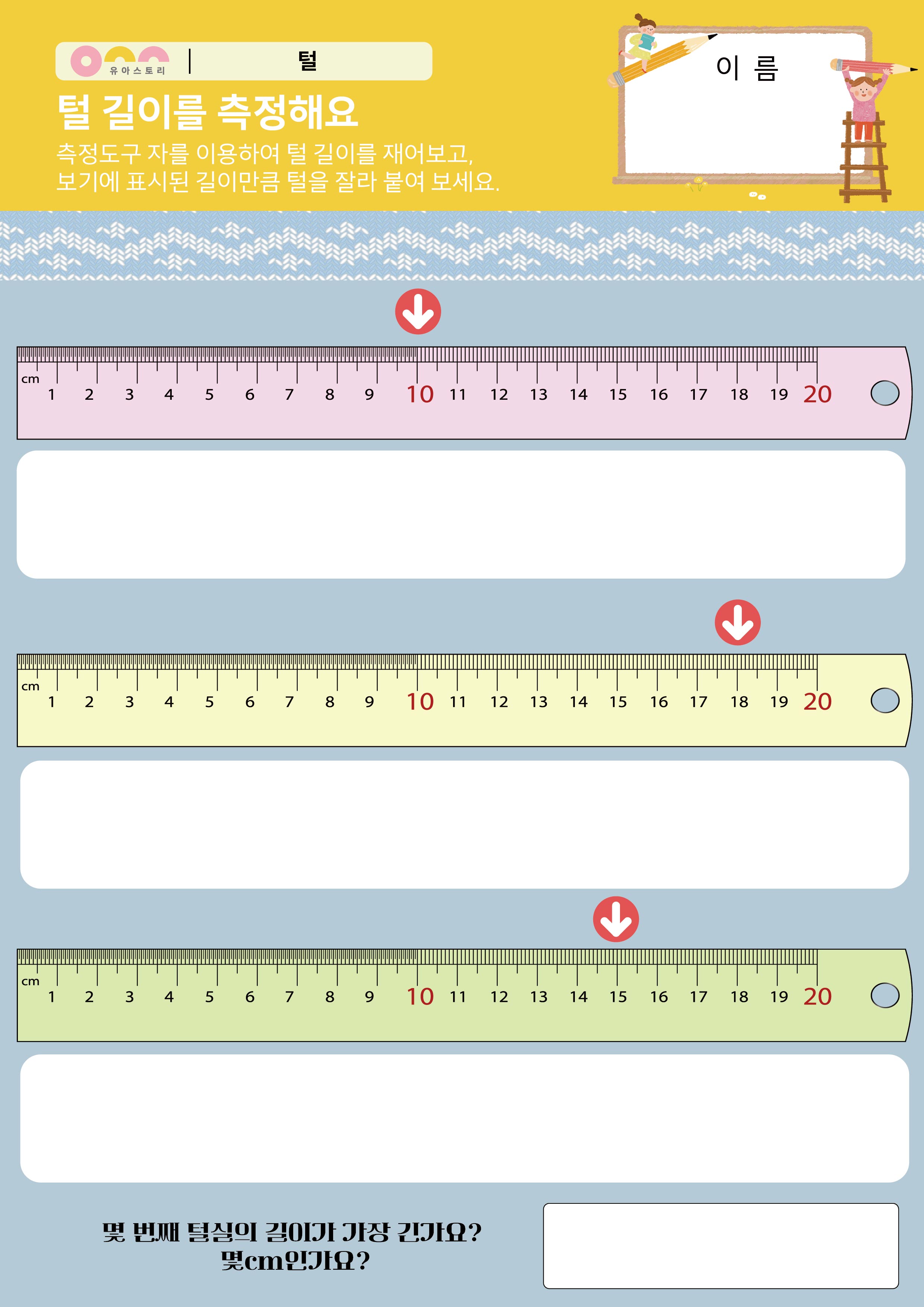 [털 길이를 측정해요]측정도구를 이용하여 털 길이를 재어보고,보기에 표시된 길이만큼 털을 잘라 붙여 보세요.