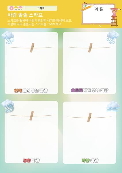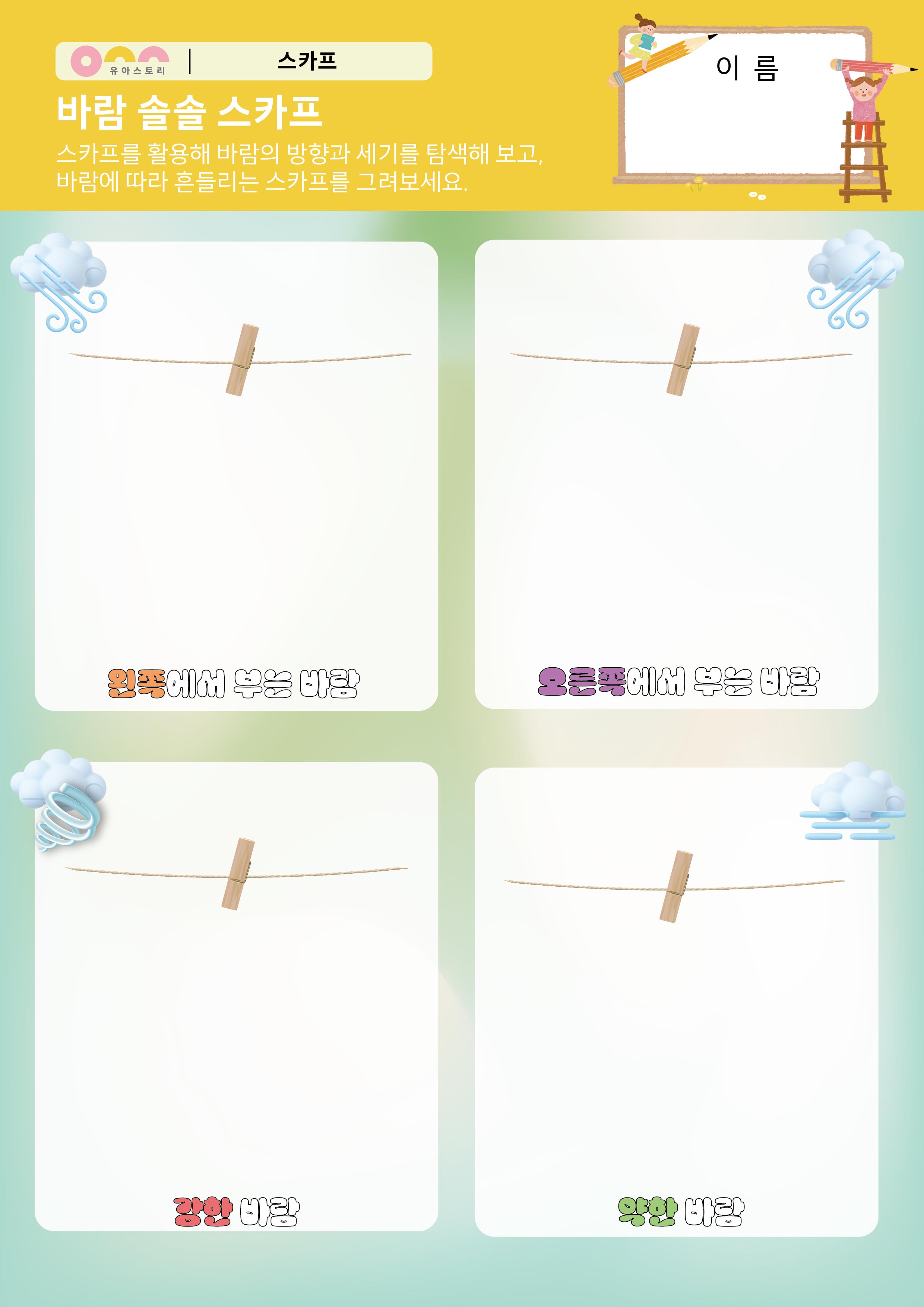 [바람 솔솔 스카프]스카프를 활용해 바람의 방향과 세기를 탐색해 보고,바람에 따라 흔들리는 스카프를 그려보세요.