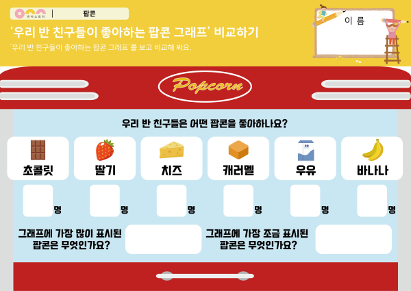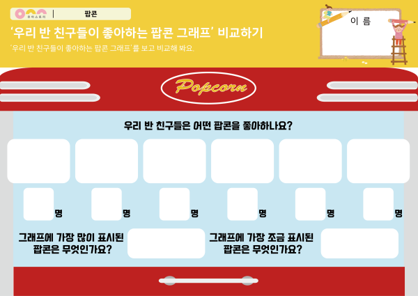 활동내용 ''우리 반 친구들이 좋아하는 팝콘 그래프' 비교하기' 수조작 활동지입니다.