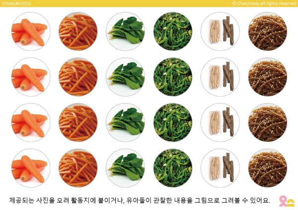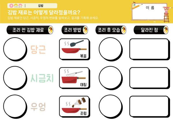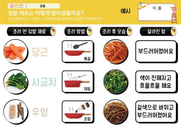 김밥 재료인 당근, 시금치, 우엉의 변화를 살펴보고, 결과를 기록해 보세요.