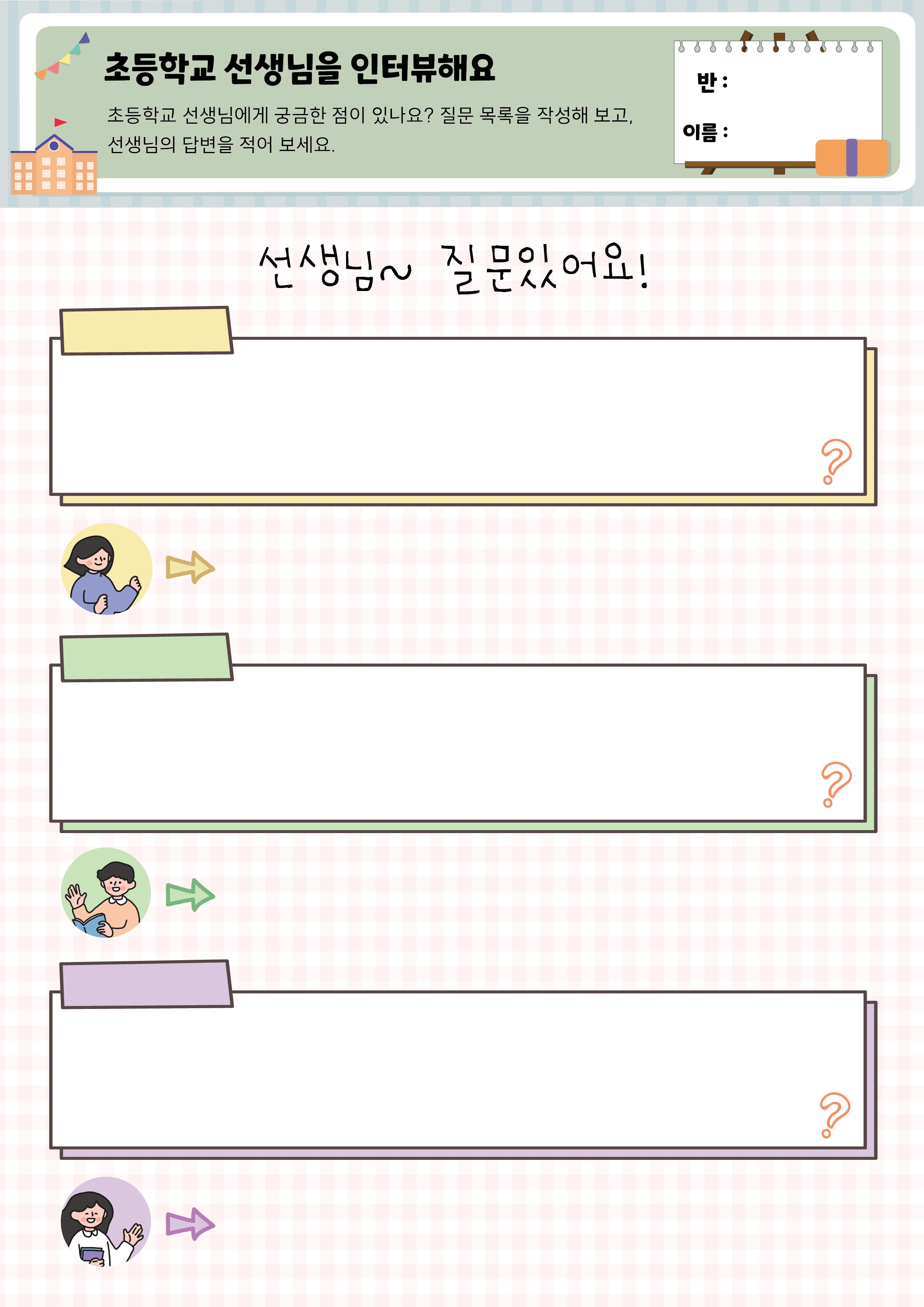 [초등학교 선생님을 인터뷰해요]초등학교 선생님에게 궁금한 점이 있나요?질문 목록을 작성해 보고, 실제 초등학교를 방문하여 선생님의 답변을 적어 보세요.