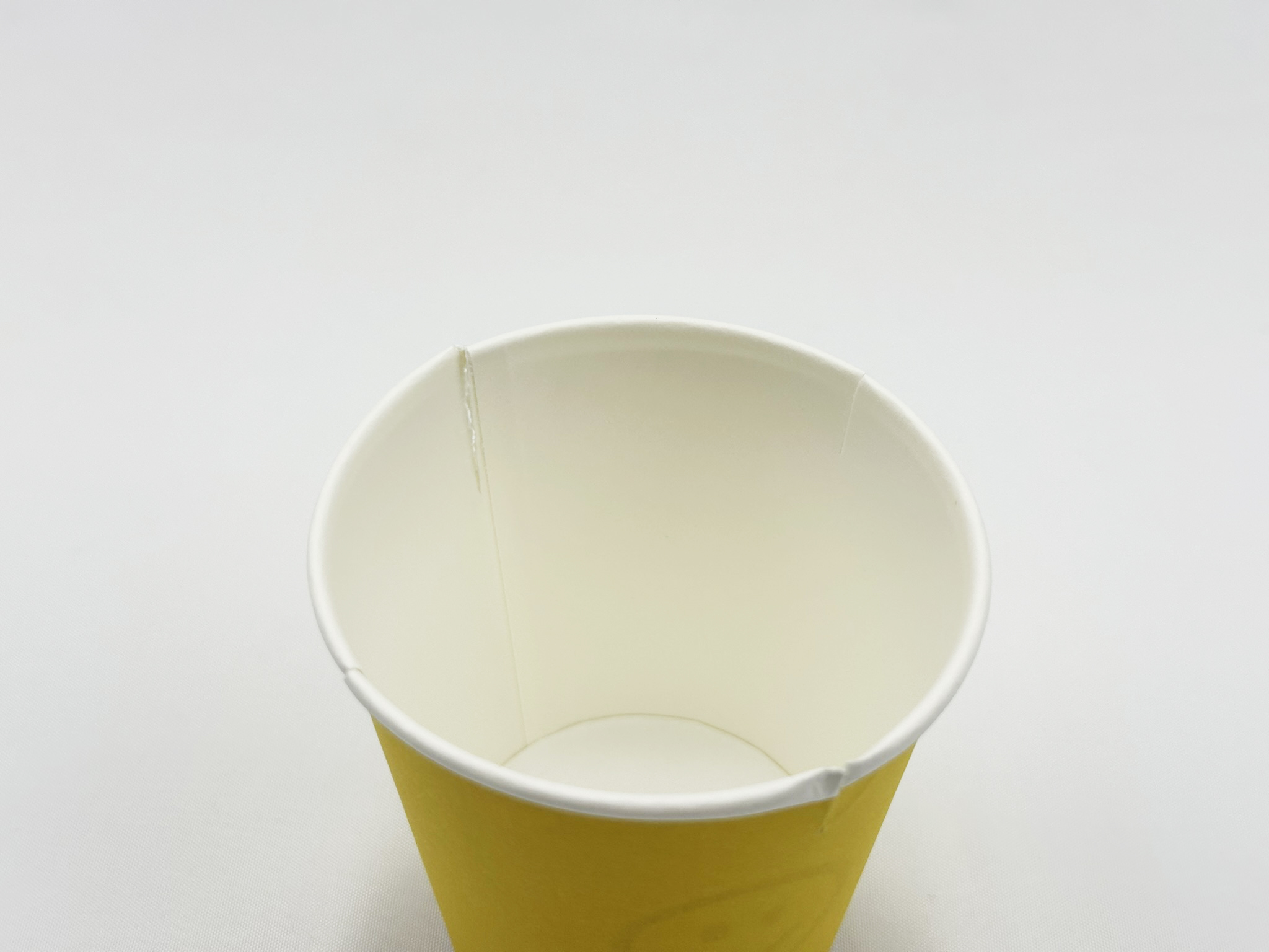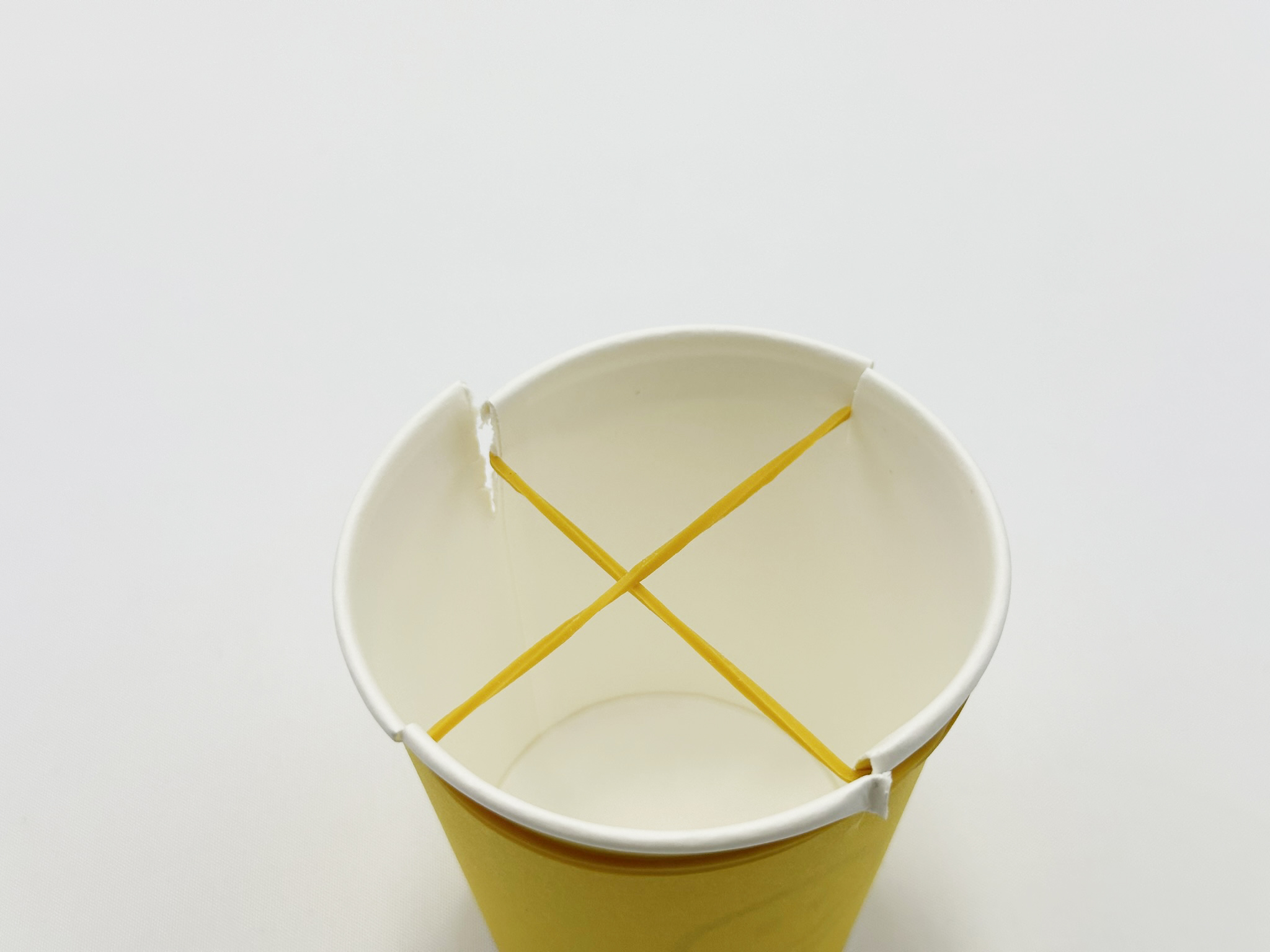 2) 종이컵을 살짝 자르고, 고무줄을 + 모양으로 건다.