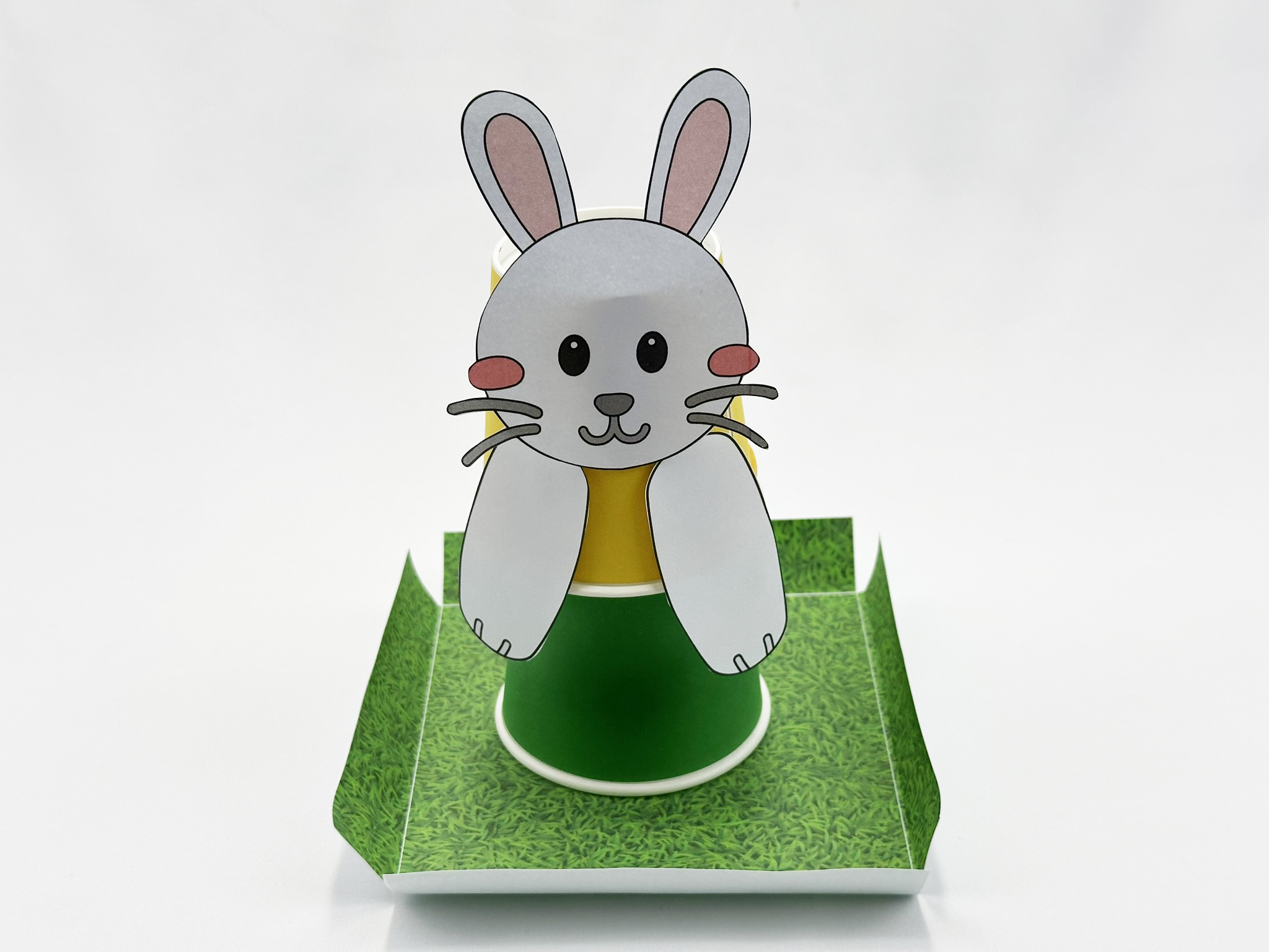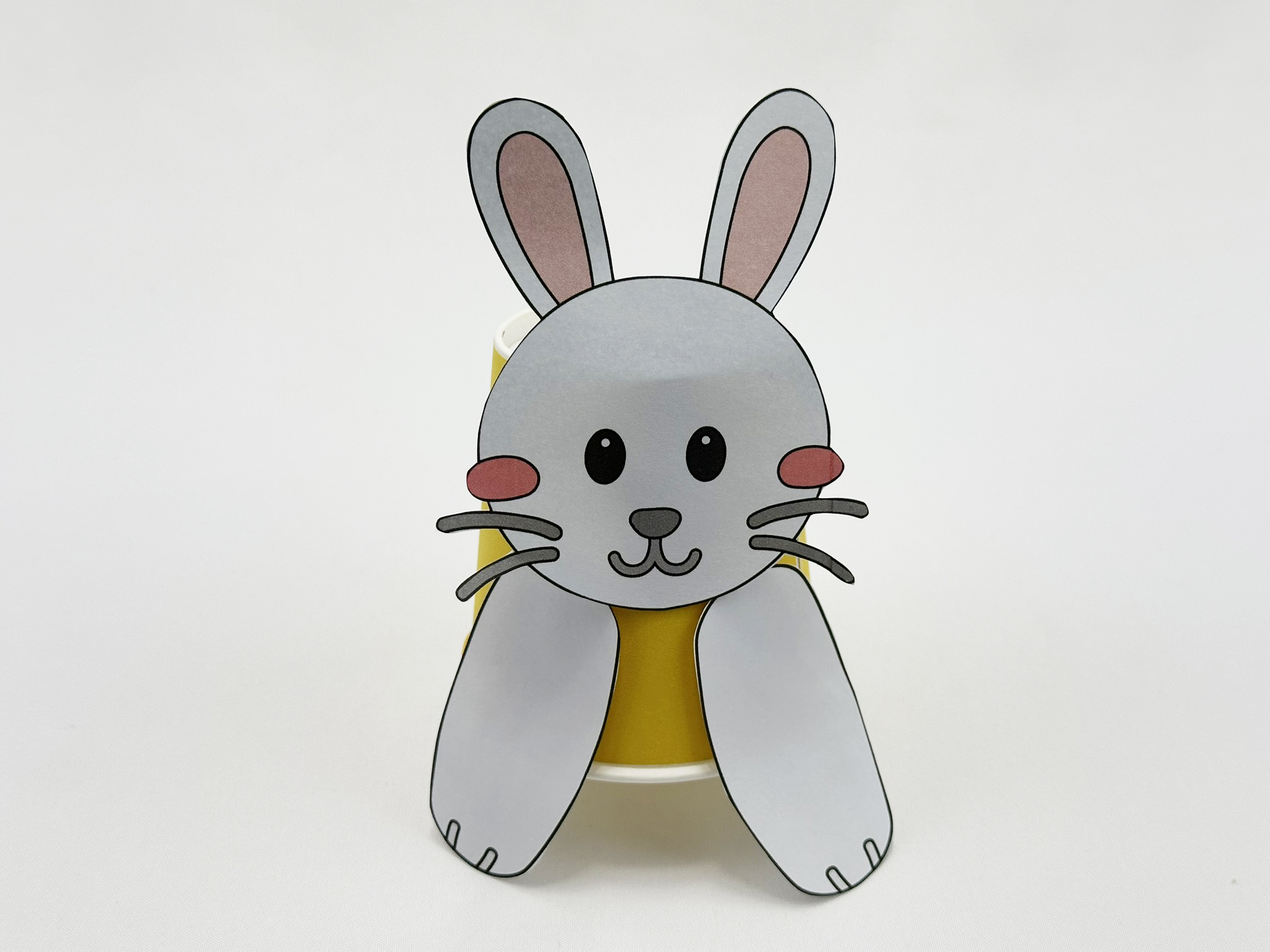 3) 고무줄을 건 종이컵에 도안을 붙인다.