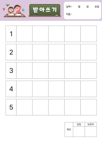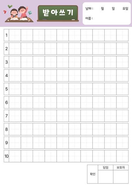 초등학교 놀이에 활용할 수 있는받아쓰기 연습장입니다.넓은 칸(5칸) / 좁은 칸(10칸) 총 2가지 버전으로 제공됩니다.