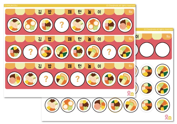 여러 가지 종류의 김밥 도안을 활용해 패턴 놀이할 수 있는 수조작 교구 도안입니다.