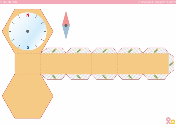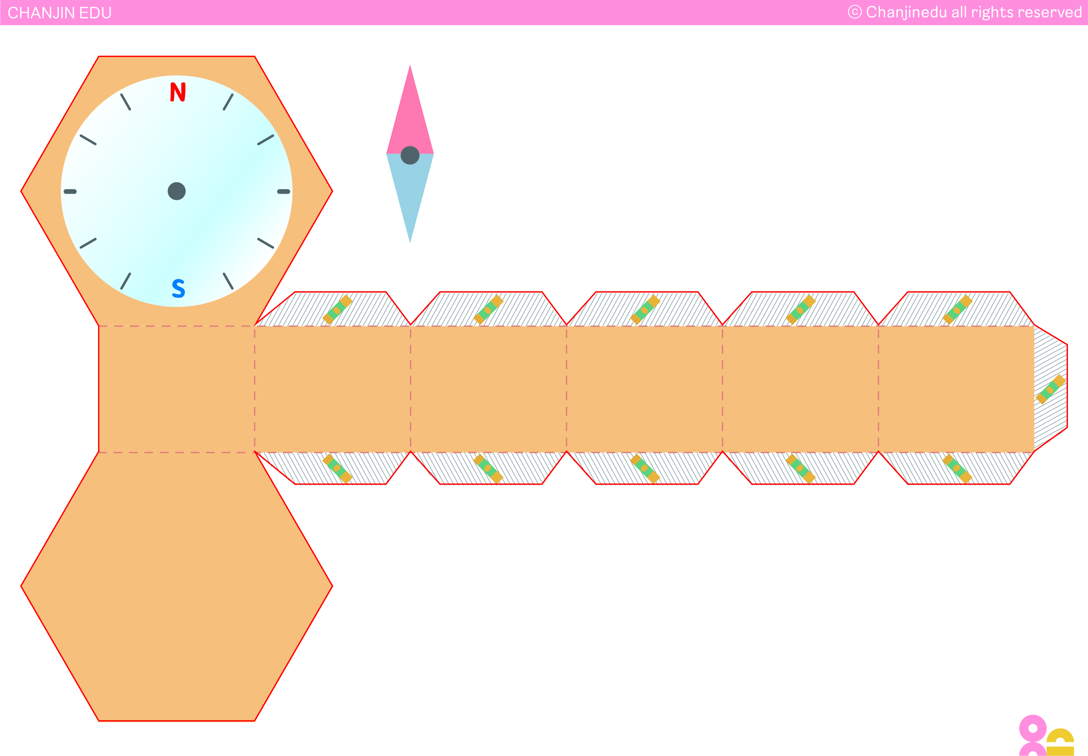 ⑧ 나침반의 윗면을 육각형 몸통 위에 붙여 완성한다.