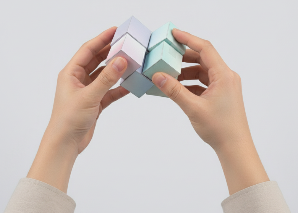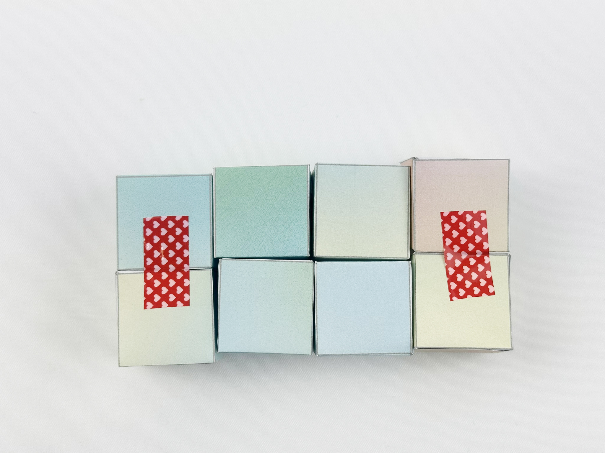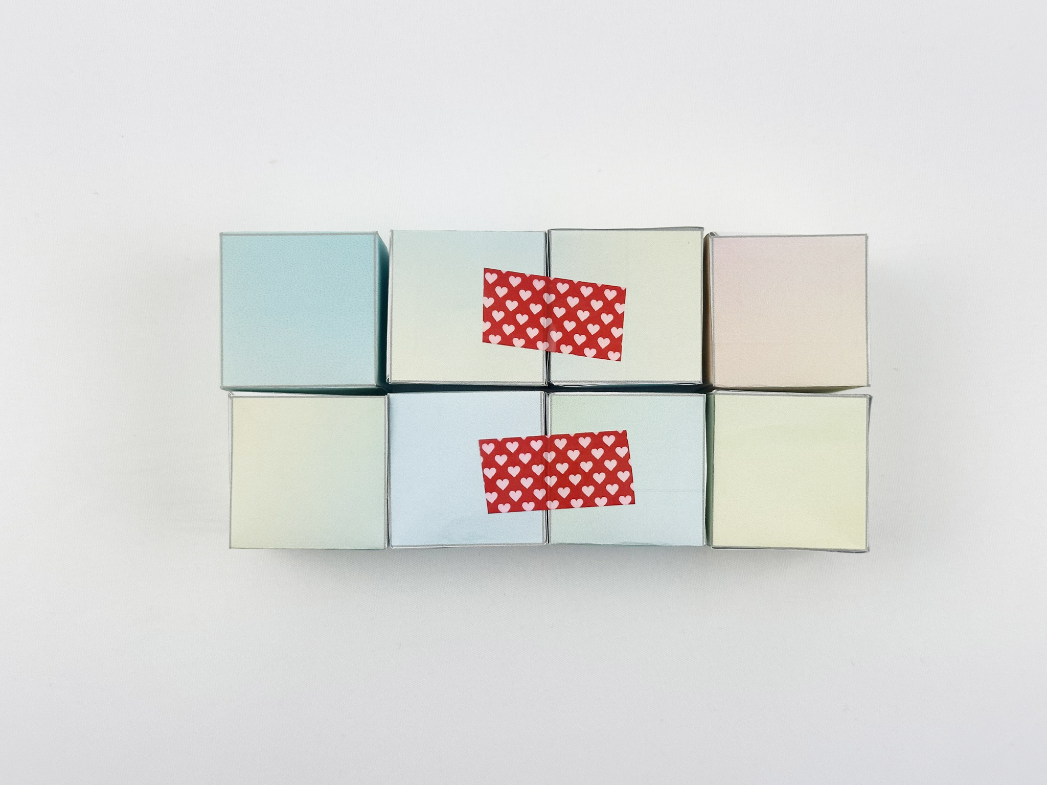 8) 큐브를 움직이며 테이프를 붙인 반대쪽에도 테이프를 붙인다.