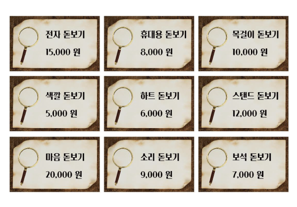 돋보기 상점 놀이에 활용할 수 있는 상품 이름표, 가격표 도안입니다.