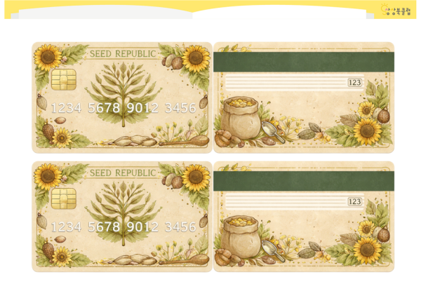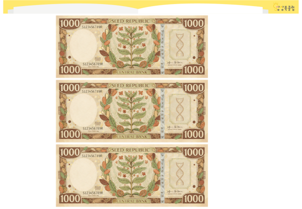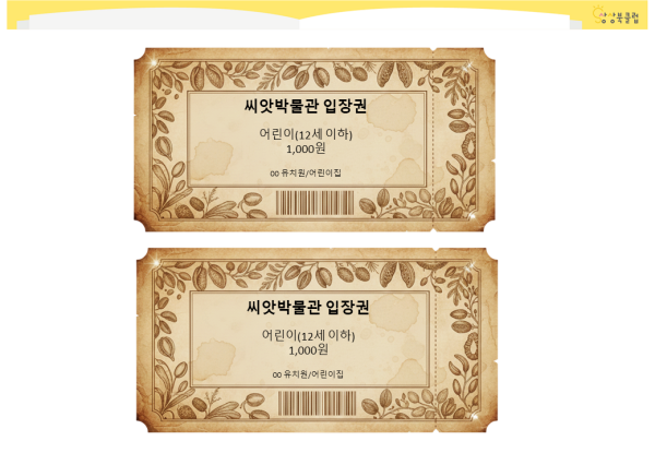 씨앗박물관 입장권, 지폐, 신용카드, 해설기 도안입니다.