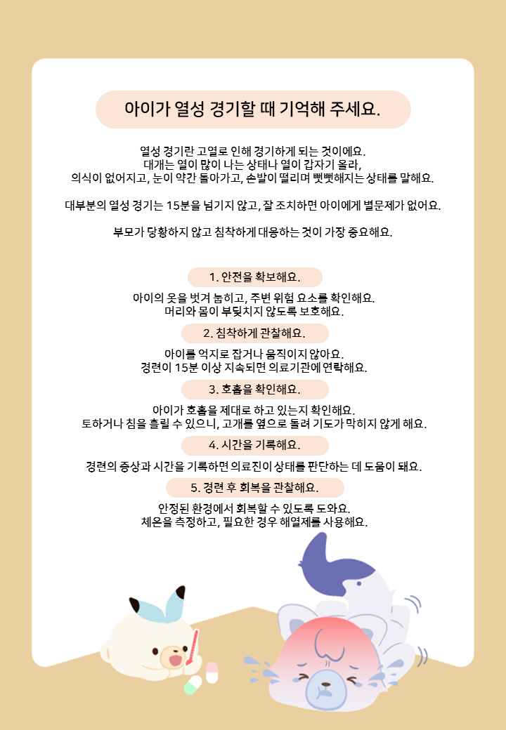 안녕하세요?대부분의 열성 경기는 15분을 넘기지 않고,잘 조치하면 아이에게 별 문제가 없어요.하지만 이 때, 부모가 당황하지 않고, 침착하게 대응하는 것이 가장 중요해요.'아기가 열성 경기할 때 기억해 주세요.' 자료를 보내드리니,가정에서도 읽어보시고 참고해 주세요.감사합니다.