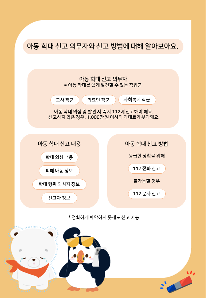안녕하세요?아동학대를 쉽게 발견할 수 있는 직군은 아동학대 신고 의무자예요.'아동학대 신고 의무자와 신고 방법에 대해 알아보아요.' 자료를 보내드리니,가정에서도 읽어보시고 참고해 주세요.감사합니다.