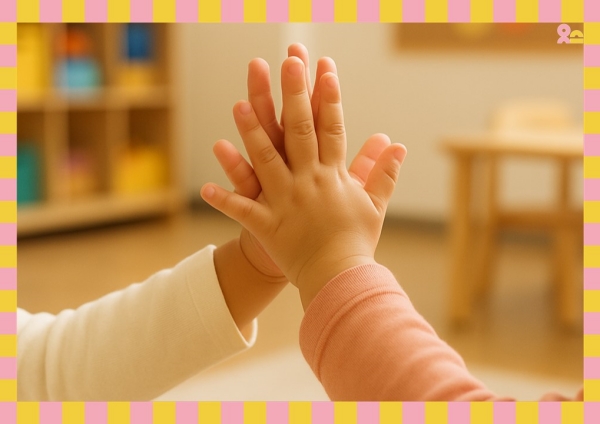 2025년 > 1월 > 1주 > 영아 > 혼합반(0,1세) > 연간놀이계획안 > 실내자유놀이 > 신체 선생님, 친구와 마주 보고 앉아 손뼉 쳐요