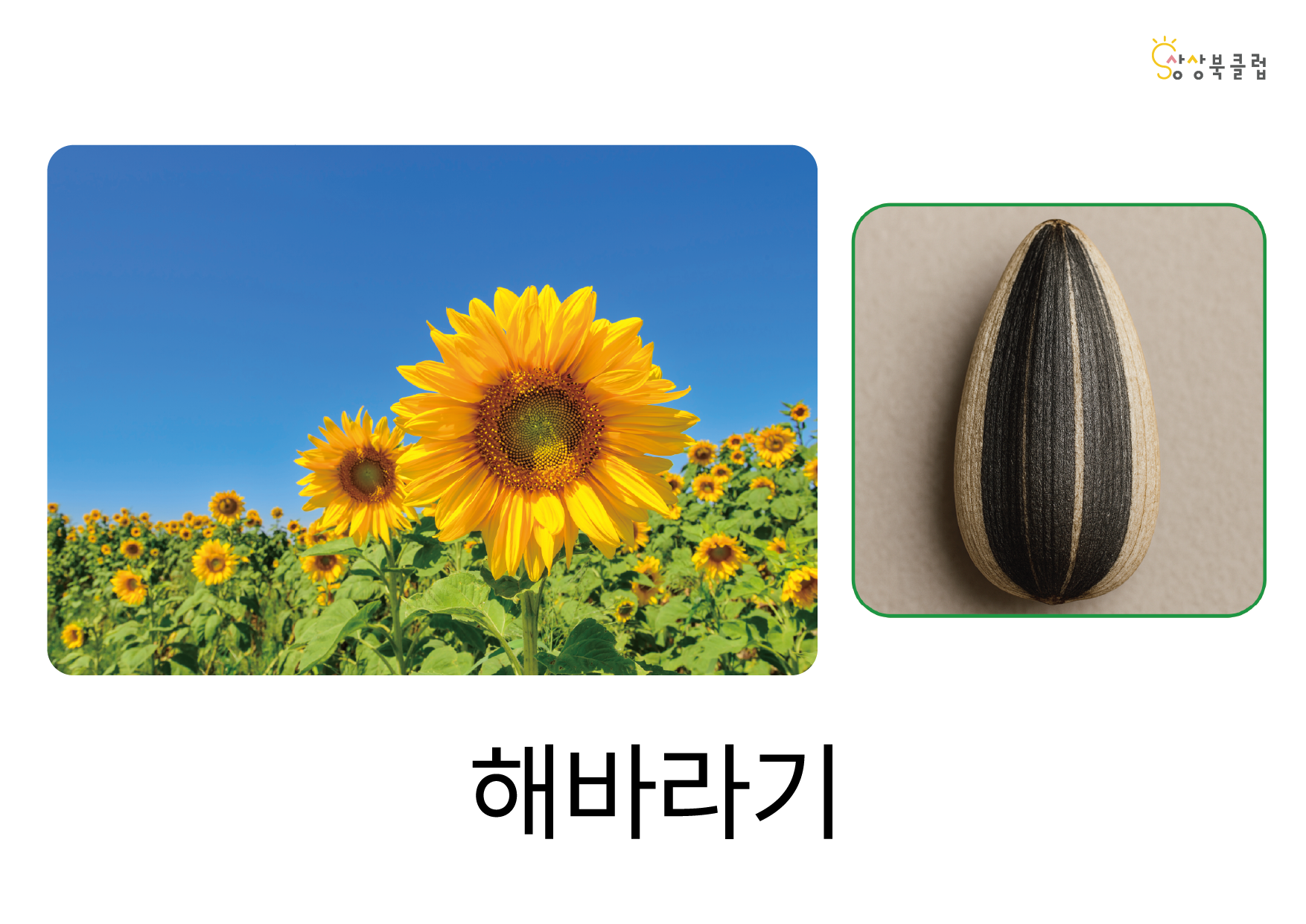 해바라기, 무궁화, 코스모스, 강낭콩, 복숭아, 풍선덩굴총 6종의 다 자란 식물의 모습과 씨앗 모습을 확인할 수 있습니다.